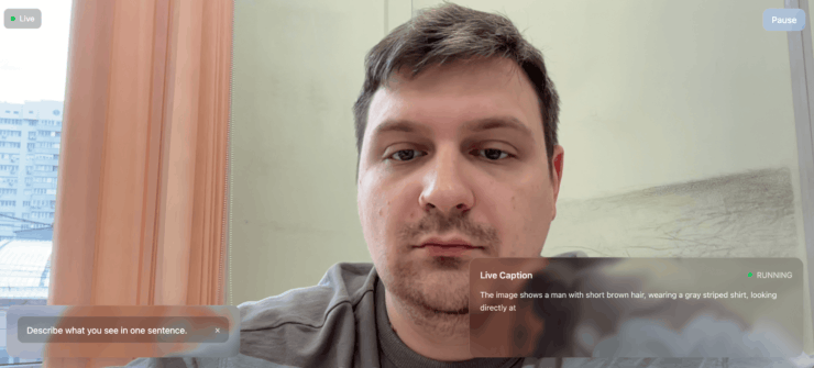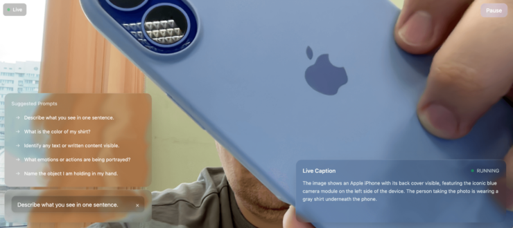 Работает это так: вы включаете камеру, и FastVLM начинает в реальном времени описывать, что она видит. Цвет вашей одежды, мимику, предметы в руках, даже текст на футболке или постере на стене — всё распознаётся и превращается в подписи. Можно выбрать один из готовых вопросов, вроде «Опиши, что ты видишь в одном предложении» или «Назови объект у меня в руке», а можно написать свой запрос.