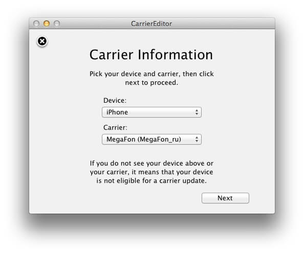 Приложение покажет окно «Сarrier Information», в котором вы увидите две выпадающих менюшки — «Device» и «Carrier». Никаких вопросов здесь возникнуть не должно, просто выбираете в них свое устройство и ищете своего оператора. Жмем «Next».