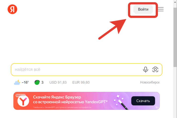- В правом верхнем углу нажмите кнопку “Войти”;