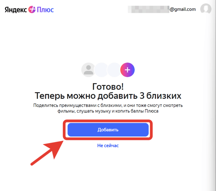 - Сразу после оформления Яндекс Плюс вам будет предложено добавить три учетные записи в семью. Нажмите кнопку “Добавить”;