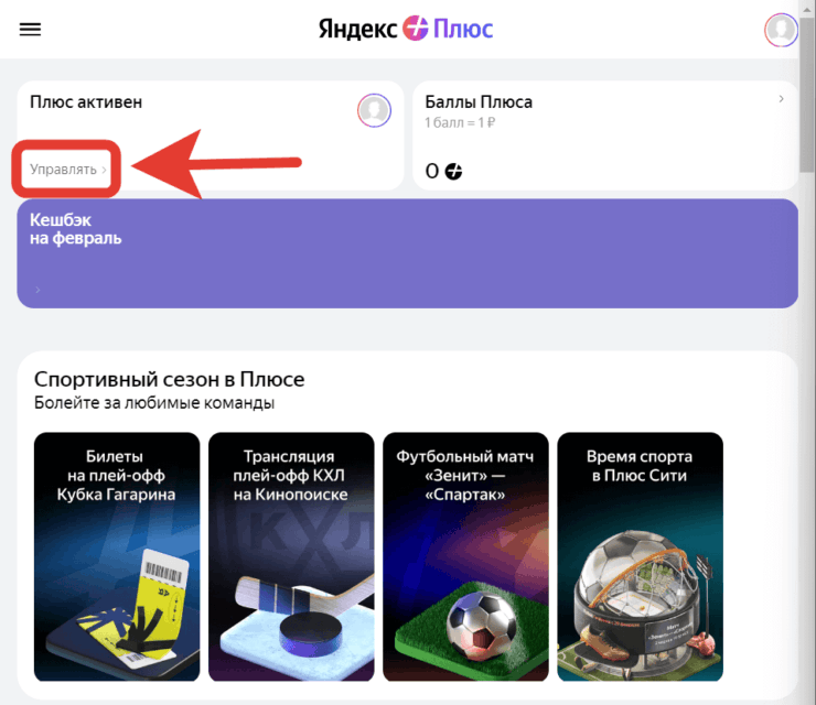 - В блоке “Плюс активен” нажмите “Управлять”;