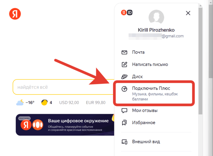 После того как учетная запись Яндекса зарегистрирована, можно переходить к оформлению бесплатной подписки Яндекс Плюс. Делается это еще проще, чем регистрация нового аккаунта Яндекс ID. Смотрите сами: