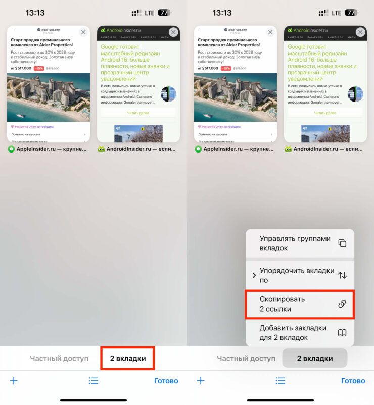 Для начала давайте разберемся, как расшарить группу вкладок на iPhone и iPad. На смартфонах и планшетах Apple это делается одинаково и работает очень просто: