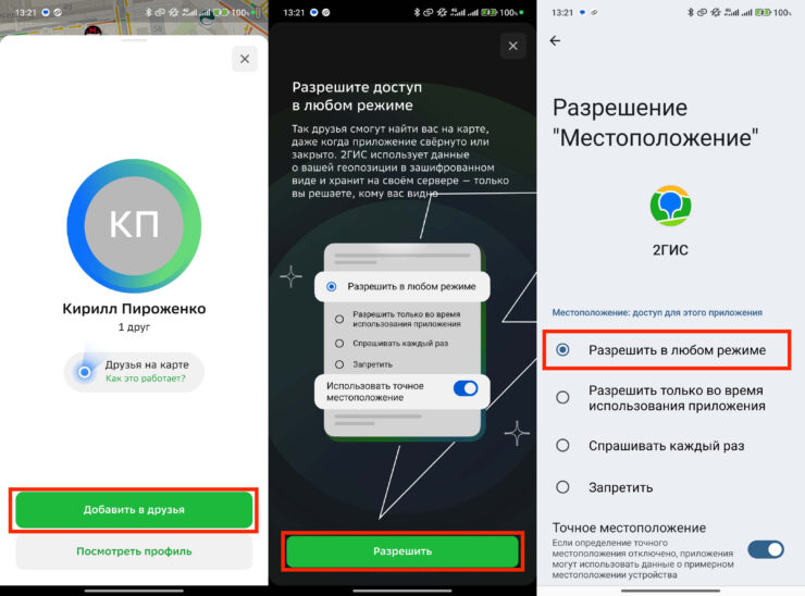 - Выдайте приложению 2ГИС все разрешения, которые оно запрашивает. В частности, постоянный доступ к геолокации;