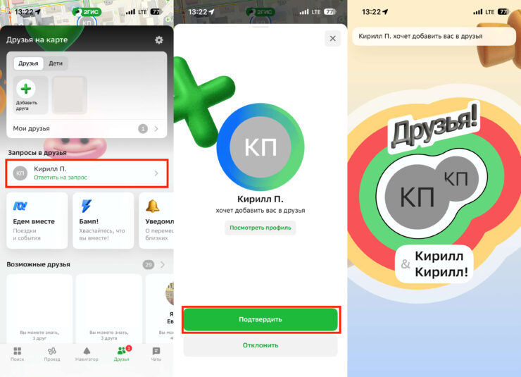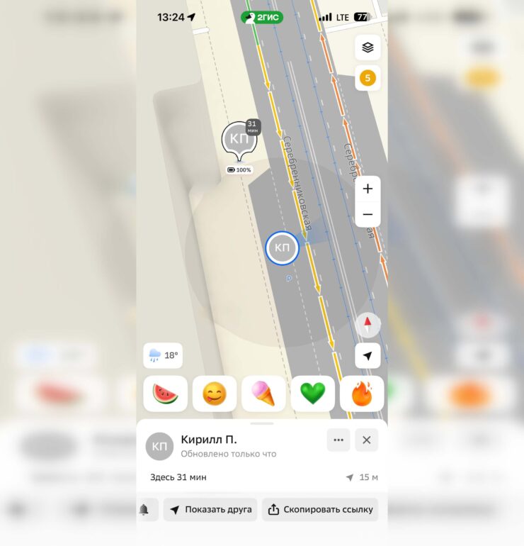 Профит! Всё настроено! Теперь на вашей карте отображаются дополнительные точки с друзьями и близкими. Если к профилю привязана фотография, то на метке будет светиться она. Если фото нет — инициалы, указанные при регистрации.