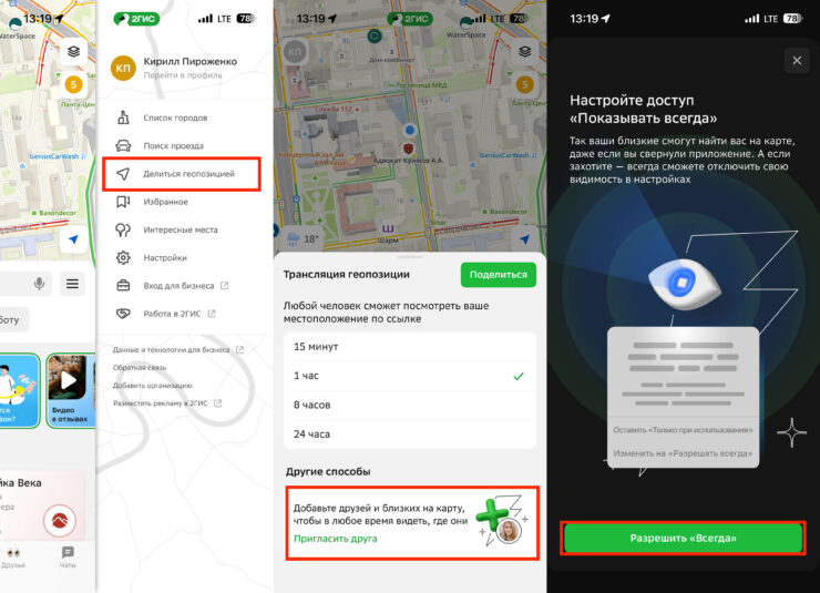 Чтобы постоянно делиться геолокацией между разными операционными системами, вам потребуется стороннее приложение. Кто-то для этого использует Google Maps, но я бы делать этого не советовал. Детализация карт для России находится на сомнительном уровне, плюс придется повозиться с настройками. А вот 2ГИС и настраивать просто, и карты у него отличные. Ну что, давайте настраивать? Сначала выполняем все действия на iPhone: