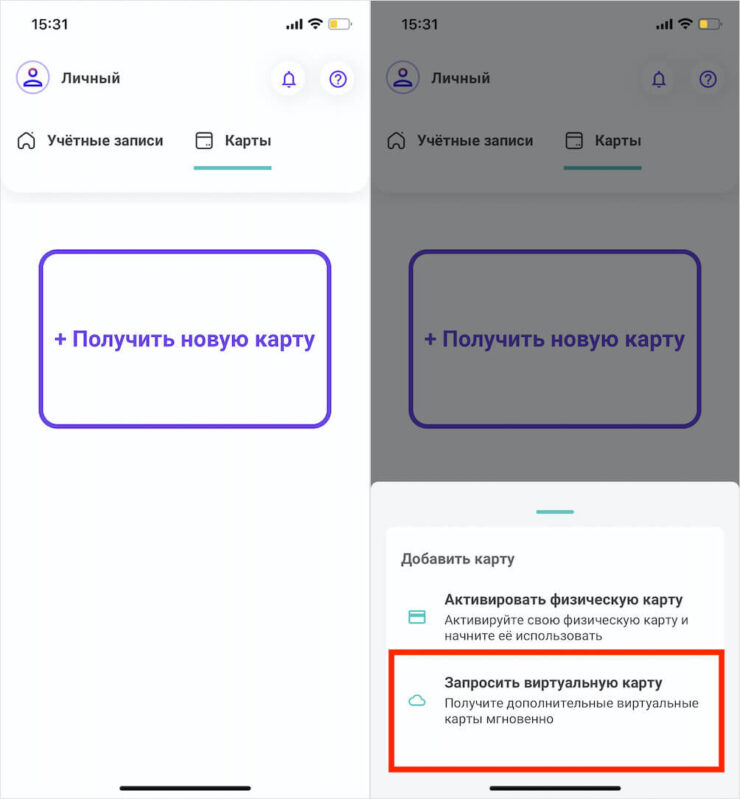 - В открывшемся окне выберите «Получить новую карту» — «Запросить виртуальную карту»;