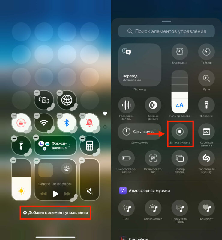 - В открывшемся меню нажмите на иконку «Запись экрана» для добавления ее в Пункт управления iPhone;
