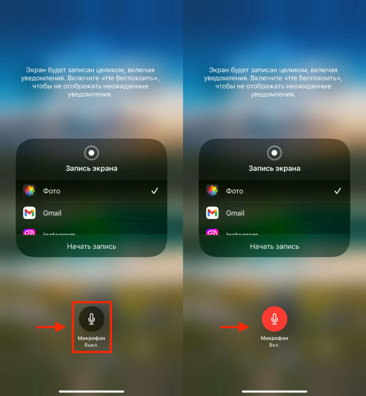 - В нижней части коснитесь кнопки «Микрофон», чтобы она загорелась красным цветом;