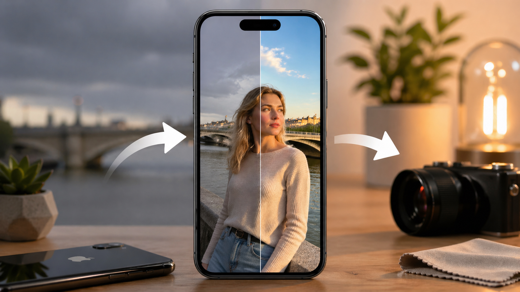 На iPhone это делается во встроенном «Фото» (ползунки «Чёткость», «Резкость», «Виньетка») или в приложениях вроде Snapseed и Lightroom Mobile. Главное правило — не переборщить с размытием фона: переразмытый фон с искусственно сглаженными деталями выглядит хуже, чем честный кадр с лёгкими недостатками.