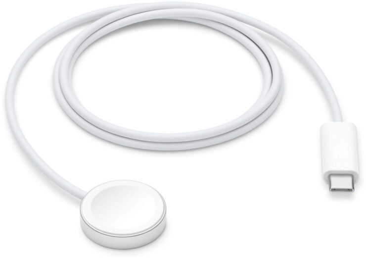 Во-первых, нужен специальный USB-C-кабель с магнитной зарядкой, который Apple стала класть в комплект с Series 7 и новее. Отличительная особенность — алюминиевое кольцо на самом зарядном диске (вместо пластика, как у старых кабелей). Если потеряли или сломался комплектный, то приобрести его можно на Яндекс Маркете.