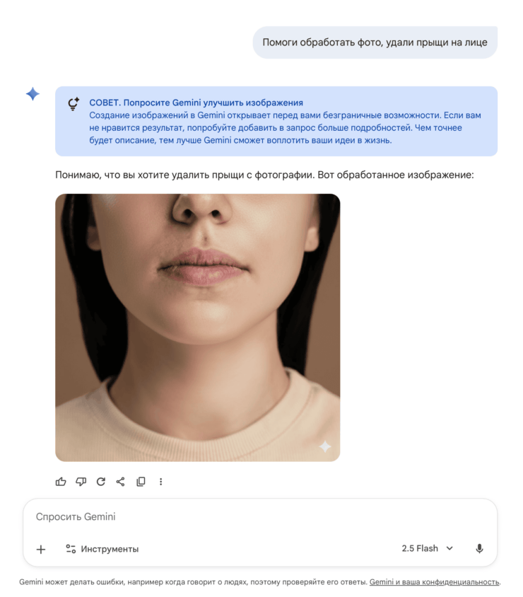 Если все понравилось, просто нажимаете кнопку “Сохранить” и получете исходник с нужными правками. Единственный недостаток — водяной знак. Нейросеть рисует фирменный ромбик на всех материалах, так что позже его придется удалять на айфоне или в фотошопе. Однако плюс Gemini в том, что чат-бот может делать не только косметическую ретушь, но и предложить улучшения освещения, фона или даже изменить стиль фотографии.