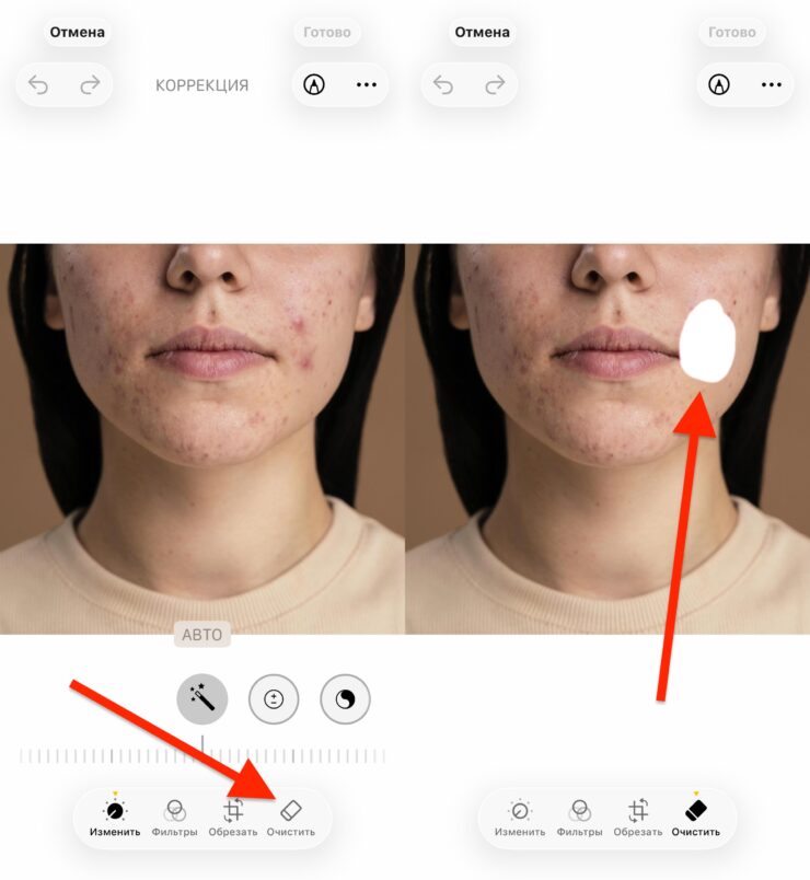 Как видите, встроенный инструмент неплохо справляется с ретушью. Правда, тут не нужно спешить и пытаться исправить все одним тапом: каждый дефект придется обводить отдельно, чтобы алгоритмы не пририсовали ничего лишнего. Все-таки нейросеть пока работает не идеально и может ошибаться.