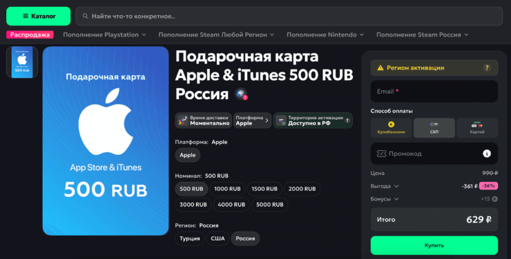 Не забудьте, что перед переносом музыки в Apple Music необходимо оплатить подписку. Проще всего это сделать с номера МТС или Билайн, но если у вас его нет, то воспользуйтесь подарочной картой Apple. Купить ее можно на сайте KupiKod. На выбор сразу семь разных номиналов: 500, 1000, 1500, 2000, 3000, 4000, 5000. Активируется карта и оформляется подписка на Apple Music так: