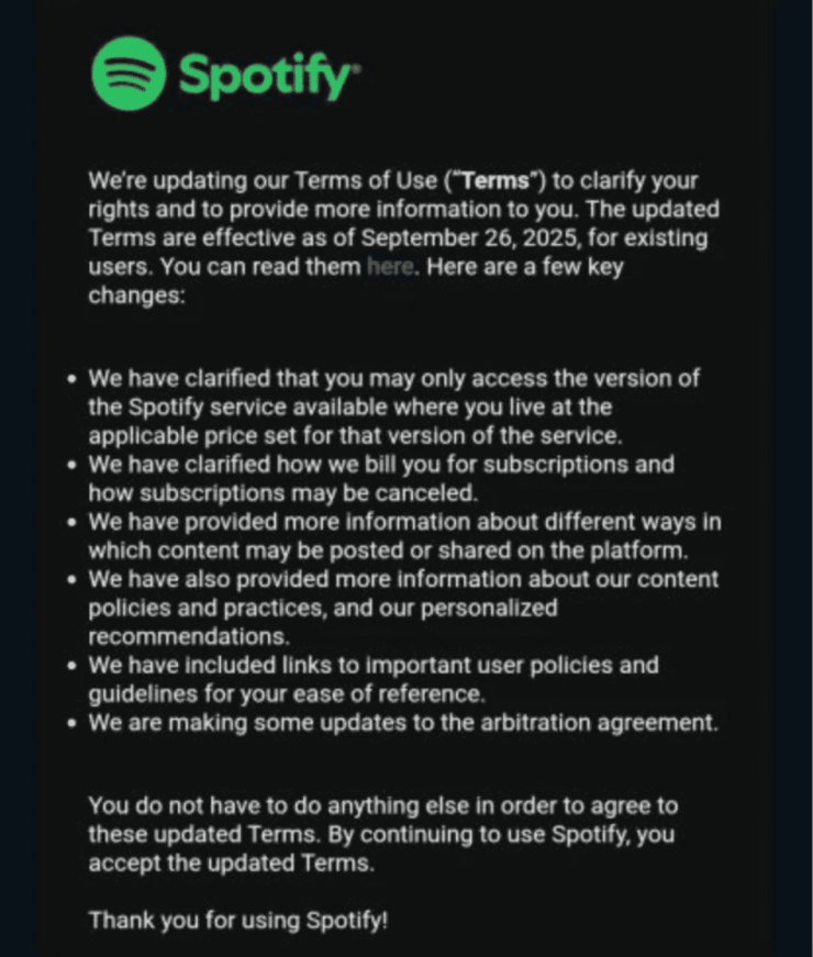 В уведомлении сообщается, что Spotify в настоящее время используется не в той стране, где зарегистрирован аккаунт, и предлагает изменить страну через настройки. Причем на это дается 14 дней. Следовательно, и цены могут измениться, и сама музыка, а в случае с Россией сервис вообще перестанет работать. Однако далеко не все получили данное письмо, да и в пользовательском соглашении в настоящее время много противоречий.