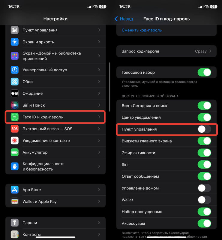- В блоке “Доступ с блокировкой экрана” отключите переключатель “Пункт управления”.
